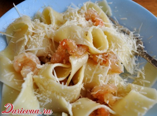 Добавляем в соус отваренную пасту. При подаче посыпаем тертым пармезаном.