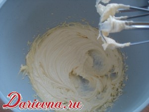 Растереть масло с сахарной пудрой до кремообразного состояния – миксером или комбайном. Добавить разрыхлитель, муку и соль.