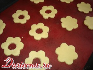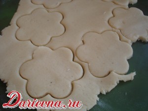 Выложить тесто на присыпанную мукой поверхность. Раскатать в пласт толщиной 5-6 мм и вырезать печеньица формочками типа «цветочек».