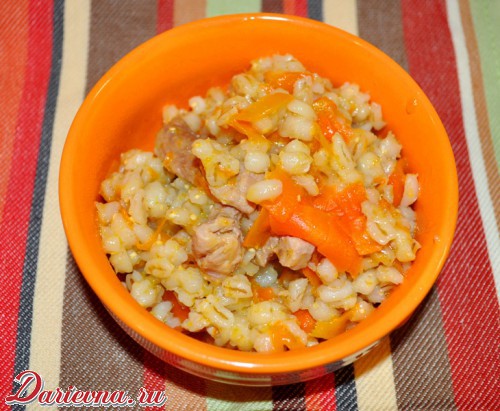 В конце в мясо добавляем перловую крупу и еще минут 15 тушим все вместе.