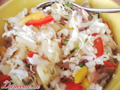 Всем, кто не любит майонез, но предпочитает сытные салаты, посвящается! Куриное филе и картофель делают блюдо способным утолить голод, пекинская капуста, болгарский перец и сельдерей вносят нотку свежести, лук - острую нотку, а заправка из йогурта и растительного масла прекрасно дополняет остальные ингредиенты.