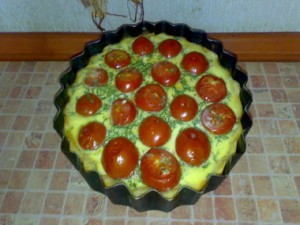 Яйца взбиваем со сметаной, добавляем мелко нарезанную зелень, заливаем помидоры сверху и ставим в духовку на 40 минут. Подаем на стол, особенно вкусно в теплом виде.