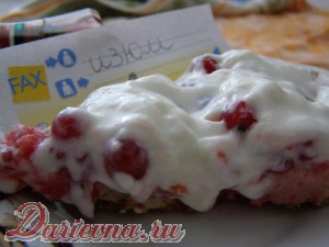 Когда тесто остынет, выкладываю помытые и высушенный ягоды. Сверху - простейший крем: сметана, взбитая с сахаром.