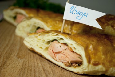 Раскатанное тесто нарезать на 4 прямоугольника 12х25см, поместить на каждый из них по кусочку филе, равномерно посыпать зеленью. Смазать края теста белком и защипнуть.