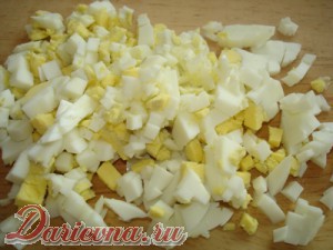 Яйца отвариваем вкрутую, мелко режем. Соединяем с капустой, солим, перчим по вкусу.