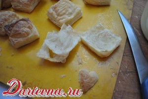 Размороженное слоеное тесто нарезаем на квадраты со стороной примерно 4 см.