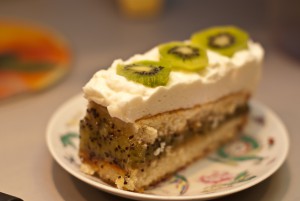 Сливочному слою тоже лучше бы схватиться, но учтите, что он схватывается гораздо быстрее, чем киви, так что держите в холодильнике совсем недолго. Я вот передержала, в результате верхний слой у меня комковатый.