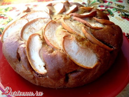 Вылить тесто в форму. Яблоки почистить, нарезать дольками и выложить на тесто. Выпекать 40-45 минут при 200 градусах.
