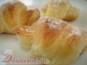 Тесто раскатать до толщины 0,6 -0,8 см., нарезать на треугольники 8х5 см. (можно и меньше – если Вы хотите рогалики малюсенькие).