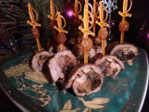 Потом выкладываем на чернослив грецкий орех (измельчить), сворачиваем рулетики, закрепляем зубочистками, обжариваем на сливочном масле в сковородке, затем добавить немного воды и тушить до готовности. Готовые рулетики нарезаем и подаем к столу!
