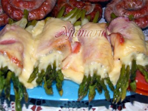 Спаржу делим на 4 части, заворачиваем её в кусочек ветчины, бекона или окорока, а потом в кусочек сыра и укладываем рулетики на помидоры.