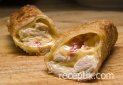 Положить на лаваш куриные полоски филе, сыра и лук с перцем. Заправить края и завернуть лаваш.
