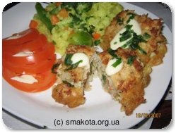 Филе хека полить лимонным соком и соевым соусом и промариновать 15-20 мин. На край каждого филе положить кусочек сыра и 3-4 каперса, завернуть рулетиком и скрепить зубочисткой. Яйца взбить с мукой в однородную массу, посолить, поперчить. Каждый рулетик обвалять в кляре о обжарить в масле до золотистого цвета. подавать с рисом, овощами и домашним майонезом.
