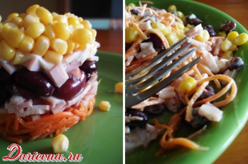 Затем – слой фасоли. Не забудем покрыть фасоль майонезом. И опять слой ветчины и слой майонеза.