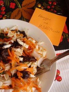 Морковь трем на терке, капусту шинкуем и складываем в тарелку. Чернослив завариваем на 5 минут в кипятке и режем, добавляем к овощам. Уксус смешиваем с солью и перцем, заливаем этой смесью салат. Даем настояться в холодильнике в течение 15 минут и украшаем зеленым лучком.