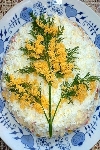 Салат «Мимоза» – популярный салат для праздничного стола. Среди его основных компонентов: рыбные консервы, лук, яйца и майонез. Название «мимоза» салат получил из-за своего оформления – внешне он напоминает цветы жёлтой мимозы, словно рассыпанные на белом снегу. Салат «Мимоза» стоит в одном ряду с салатом «Оливье» и с селёдкой под шубой, на праздничном столе они частенько мирно соседствуют друг с другом.