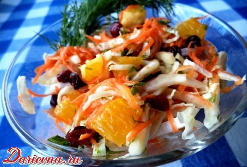Капусту помыть и тоненько нарезать. Морковь натереть на средней терке. Зелень помыть и мелко нарезать. Апельсин тщательно очистить и нарезать на кусочки.