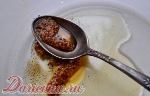 Мед, горчицу, лимонный сок, оливковое масло, соль и перец хорошо смешиваем.