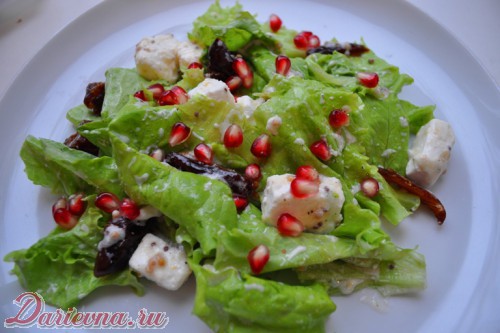 Смешиваем все аккуратно руками с салатной заправкой. Выкладываем на тарелку, посыпаем гранатовыми зернами.