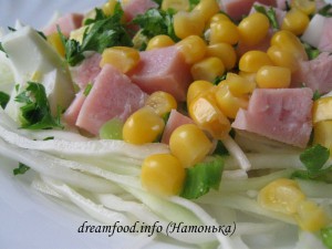 Порезать соломкой белокочанную капусту, добавить консервированную кукурудзу, порезанные кубиками вареные яйца, ветчину и заправить майонезом.