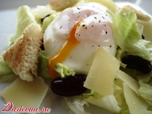 Ингредиенты вы можете менять на ваше усмотрение: можно убрать фасоль, добавить помидорки и (или) ветчину... словом, смотрите сами. Но вот сухарики, пекинская капуста и яйцо-пашот - основа такого салата.