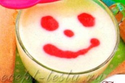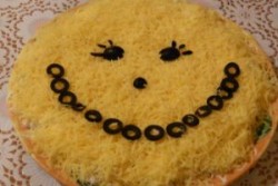 Есть салат, например. Он, на мой взгляд, интересен не столько наполнением, сколько оригинальным оформлением. Уверена, любой ребенок, даже самый капризный в еде, с удовольствием съест это блюдо и попросит добавки. Как вариант - манный десерт. Тоже со "смайликом". Торт - разумеется, улыбающийся. Или "стаканчик"-"смайл" для любого напитка.