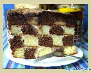 В форму сначала выложить самое большое кольцо белого коржа, потом второе по величине кольцо темного коржа, потом третье по величине кольцо белого коржа, потом четвертое по величине кольцо темного и пятое по величине кольцо белого.