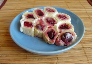 Блины получились достаточно тонкие и без дырочек. В них удобно заворачивать начинку. А заворачивать мы будем вишни.