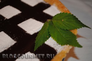 Перед подачей выстилаем полосками бумаги (или вырезаем какой-нибудь орнамент на бумаге) и посыпаем сахарной пудрой.