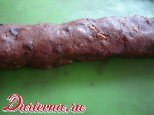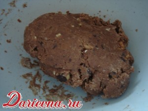 Просеять муку с солью, разрыхлителем и какао. Соединить масляно-яичную смесь, муку, орехи и шоколад, замесить тесто. Оно будет немного липнуть к рукам, это нормально.