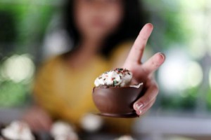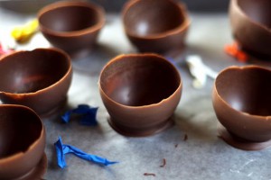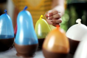 А теперь самое веселое – лопаем шарики! Аккуратно убираем остатки шариков и вуаля, у нас получились шоколадные вазочки.