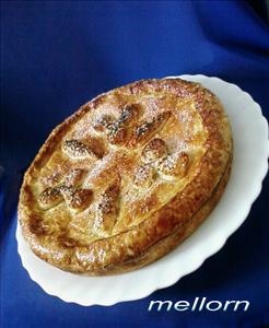 Из остатков теста сделать украшение. Пирог смазать желтком. Посыпать сахаром и украсить маком и кунжутом.