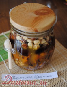 Банку вымыть и хорошо высушить. В банку слоями выложить сухофрукты и орехи, каждый слой заливая медом так, чтобы все свободное место было им заполнено.