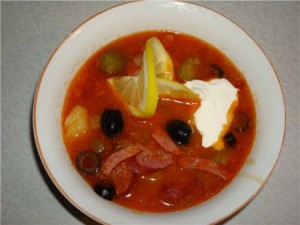 Нашинкованный лук спассеруем с маслом, добавим томат-пюре и пассеровать все вместе. В кипящий бульон положим нарезанные мясные продукты, картофель, нарезанный кубиками, и варим 10–12 минут, после чего добавим припущенные огурцы, пассерованные лук и томат, лавровый лист. Варим еще 10 минут. Подадим со сметаной и зеленью.