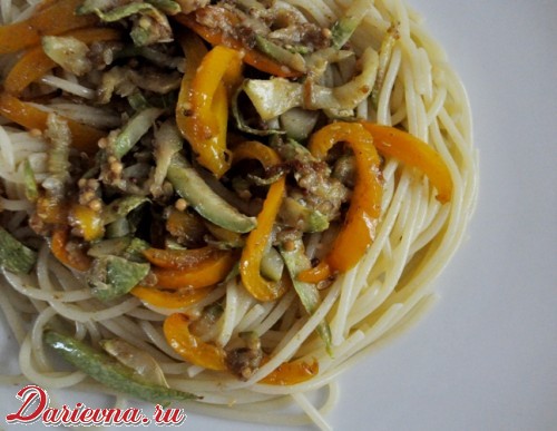 На среднем огне обжариваем кабачок и перец. Добавляем соевый соус, горчицу, солим.
