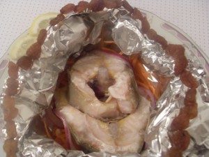 Анна Тимофеева предлагает к конкурсной ухе приготовить запеченую рыбу: "После рыбного супчика можно приступить и ко второму из оставшейся части рыбы. Предлагаю приготовление в фольге, при котором сохраняется сочность и вкус рыбки."