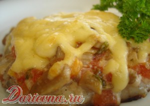 Свинину режем на порционные куски, солим, перчим и отправляем на смазанный подсолнечным маслом противень. Помидор ошпариваем кипятком, снимаем кожицу. Мелко нарезаем помидор, лук, грибы и зелень, заправляем майонезом. Всю эту массу выкладываем на мясо. И отправляем в разогретую до 220 гр. духовку на 10 мин. Через 10 мин посыпает сверху тертым сыром и отправляем опять в духовку, уже на 5 мин. Достаем, украшаем зеленью и подаем.