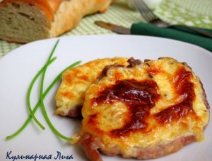 Мясо порезать на небольшие порционные кусочки и отбить. Каждый кусочек посолить и поперчить с обеих сторон. Приготовить соус из толчённого чеснока, сметаны и тертого сыра. Каждый кусочек обмазать соусом и выложить на противень, смазанным растительным маслом. Разогреть духовку до 200*С и запекать мясо в течение 1 часа.