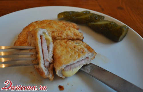 Муж упрямо называет это блюдо "кордон блю". В свете популярных нынче споров о том, как должно выглядеть и готовиться то или иное популярное и известное блюдо, я предпочитаю избегать громких слов и оставлять те названия, которые вряд ли вызовут у кого-то желание покритиковать. В общем, представляю вам свинину с копченым мясом и сыром!