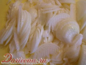 Нарезаем полукольцами лук. Обжариваем его на растопленом сливочном масле или маргарине - это важно, не заменяйте масло растительным, оно разжижит начинку.