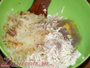 Смешайте сыр, обжареный до золотистости лук, яйцо и перец. Я не солю начинку, обычно хватает соли, которая есть в плавленых сырках.