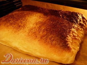 Переворачивайте на бумагу для выпечки, выкладывайте вместе с ней на противенб. Сверху тесто можно посыпать кунжутом.