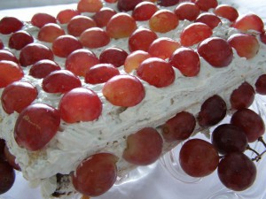 Коржи смазываем кремом, украшаем виноградом.