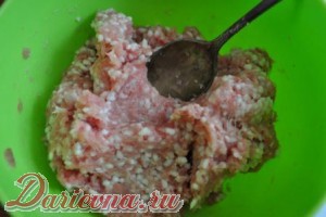 Рис отвариваем до полуготовности, смешиваем с мясным фаршем, солим, перчим.
