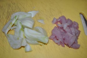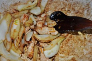 Нарезаем индюшку полосочками, фенхель - примерно такими же кусочками.