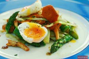 Авторский блог о еде Spicyblog.ru рассказывает, что лисички обладают совершенно неповторимым ароматом, который запоминается и создает ощущение особенности предстоящей трапезы. Фенхель - особенно сочен и полон вкуса и свежести. Его легкая горчинка отлично сбалансирует сладость лисичек. Спаржа будет полезным дополнением к салату, а вареное яйцо добавит сытности. Итак, теплый салат с лисичками и фенхелем.