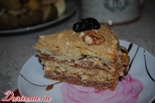 Каждый корж разрезаем вдоль на два. Формируем торт, выкладывая коржи попеременно и промазывая их кремом. Бока и верх торта также смазать кремом и украсить по желанию орехами и сухофруктами.