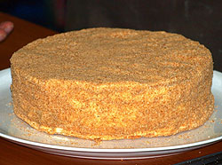 Бока обсыпьте медовой крошкой. При желании можно глазировать поверхность торта помадкой и украсить растопленным шоколадом с помощью кондитерского конверта.