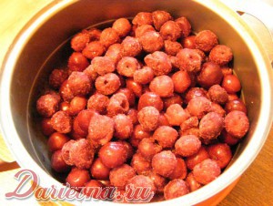 Я беру вишню, консервированную в собственном соку. Как-то раз получилось сделать с замороженной - визуальный результат не очень (на фотографии видно, что ягода дала слишком много сока), хотя на вкусе это никак не сказалось.