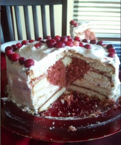 А теперь… Сборка. Промазываем один корж, сверху – второй. И «вырываем» ложкой конусовидный канал вниз, по форме объемного сердца. Заполняем красным коржом (можно порвать, можночерез мясорубку). Вторые два коржа -аналогично промазываем и укладываем друг на друга, здесь тоже вырезаем канал, но оставляем посередине «островок». Вторые два коржа переворачиваем сверху на первые. Украшаем по желанию.